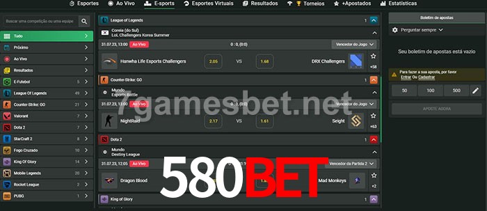 O 580bet oferece uma grande seleção de opções de apostas em e-sports com probabilidades competitivas